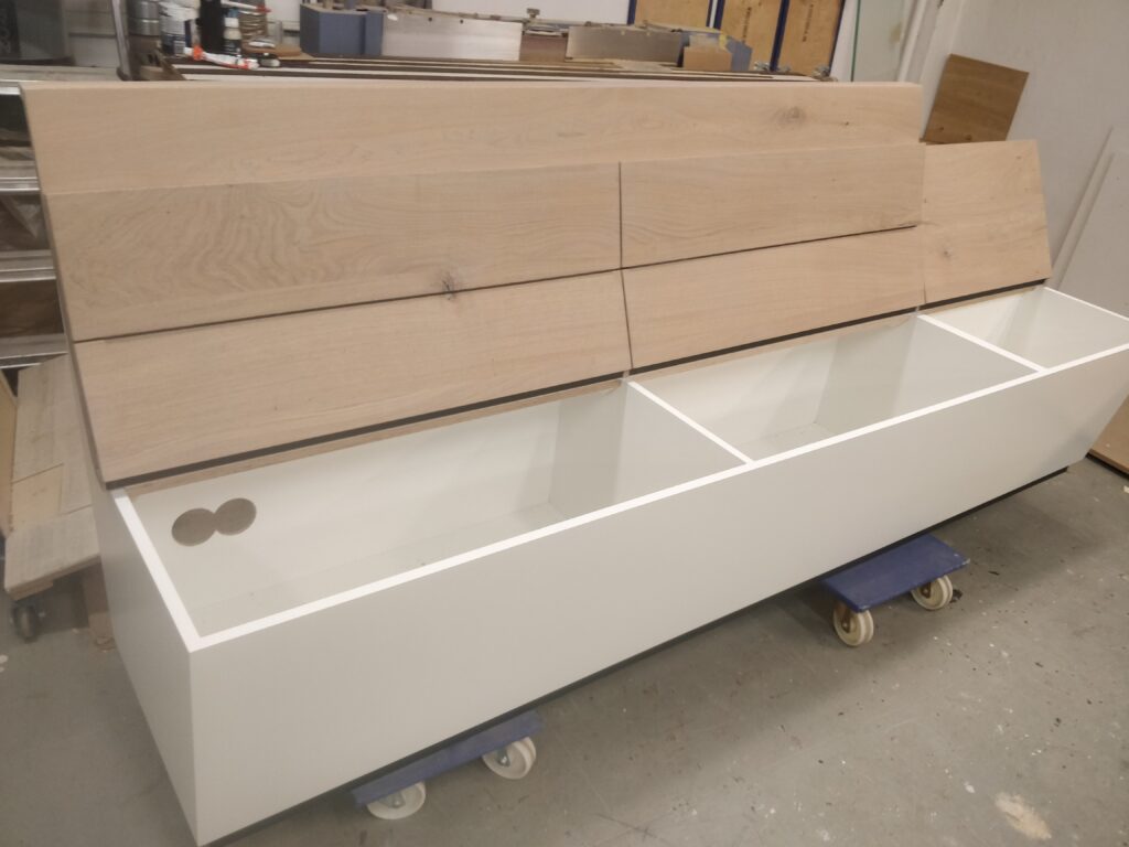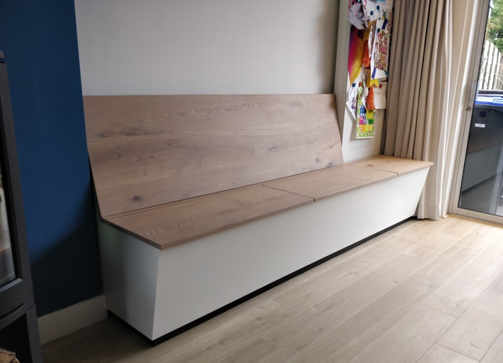 Bank voor bij de eettafel met eiken rug en zitting. Veel opbergruimte.