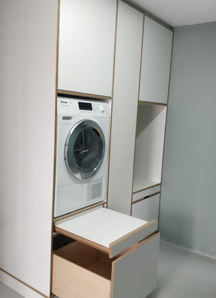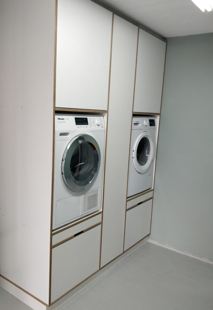 Stevige kast voor wasmachine en droger. Uitgevoerd in wit berken multiplex.