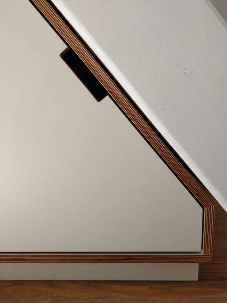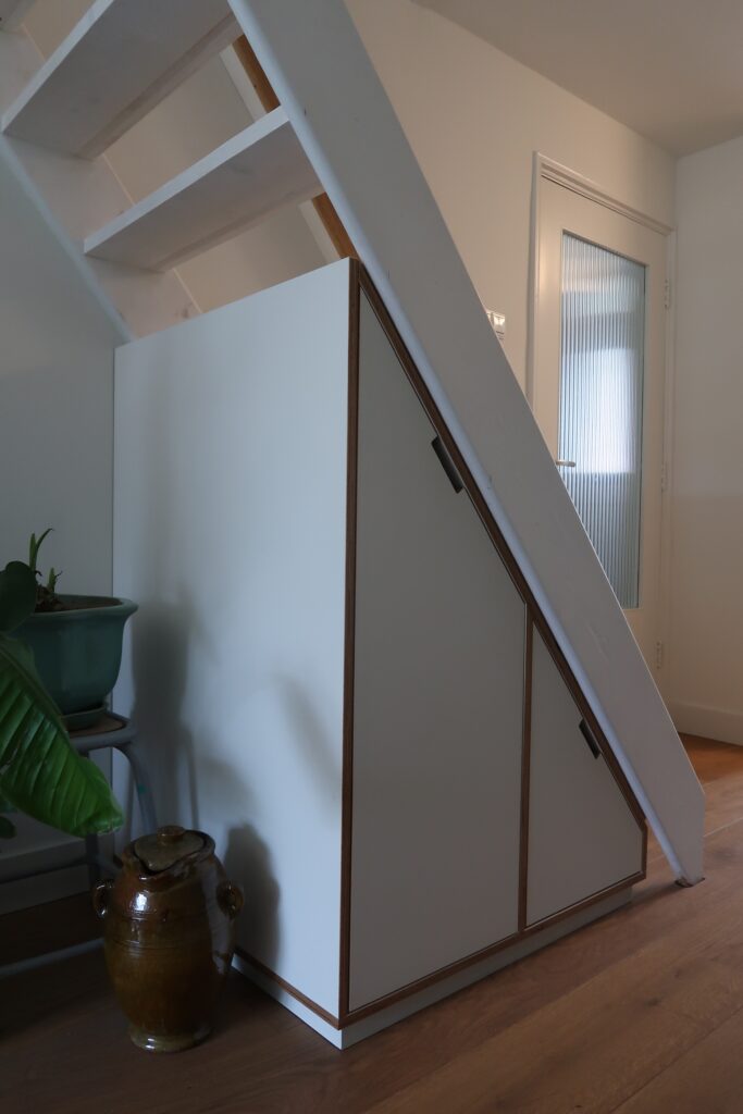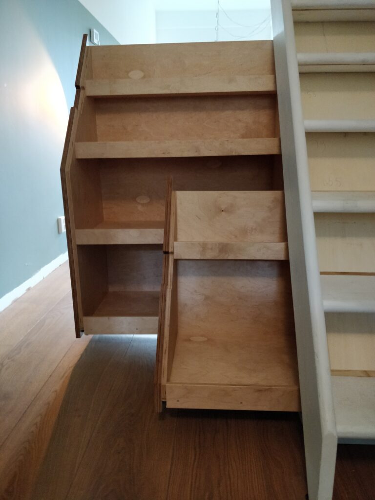 Schuine ladekast onder trap. Laden van 75 cm volledig uittrekbaar.