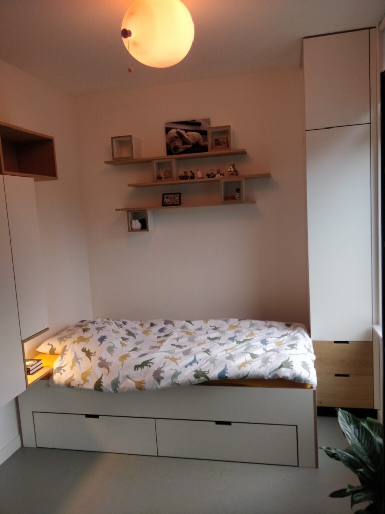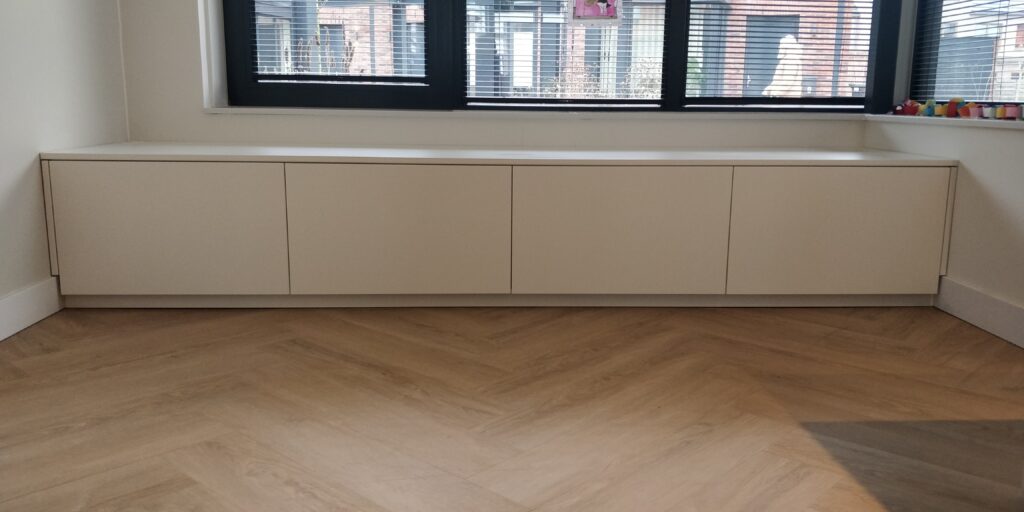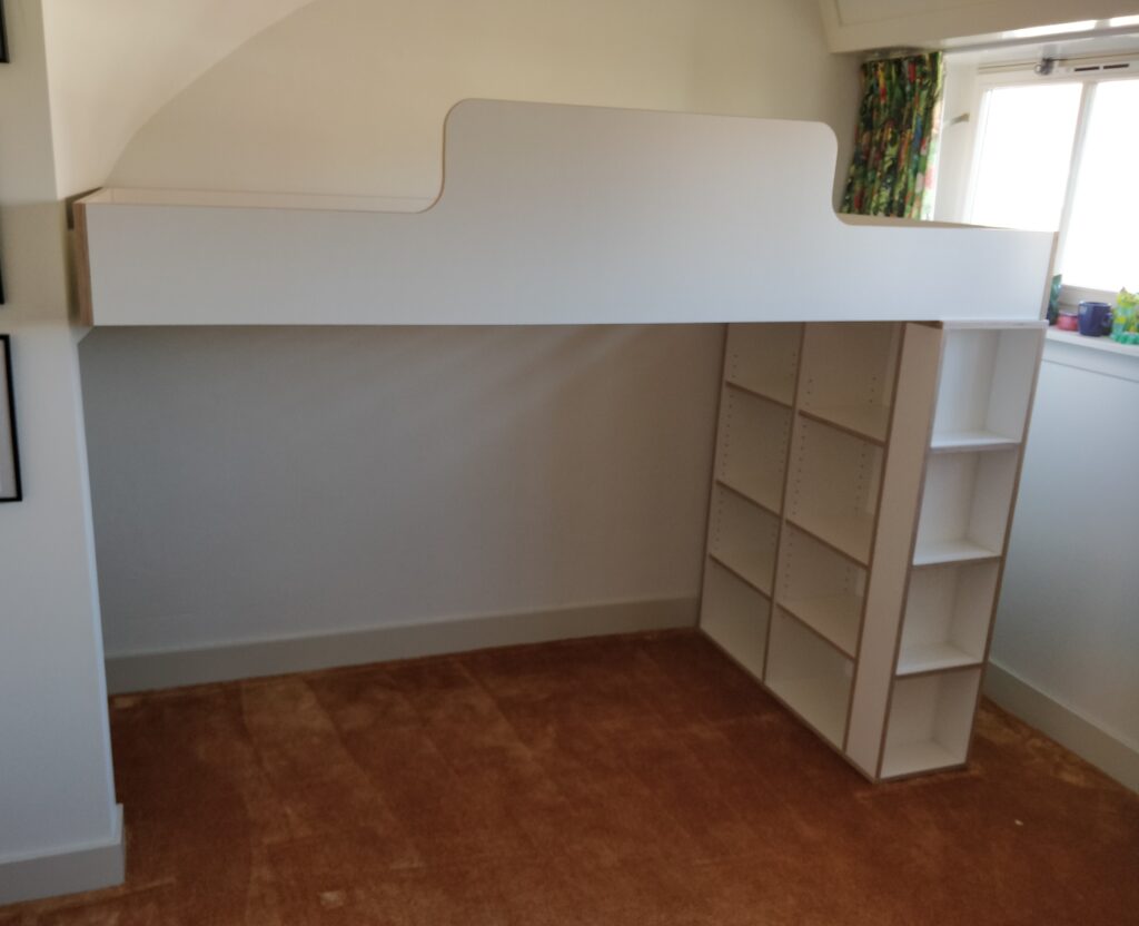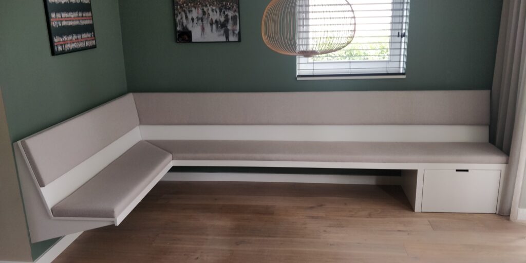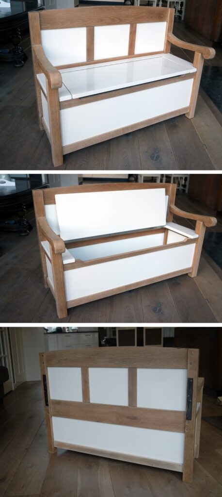 Bank bij eettafelHangende bank bij eettafel met grote lade voor speelgoedWastafelmeubel in eikenBank in erkerEiken wastafelmeubel Complete kinderkamerHangende notenhouten nachtkastjesHangende hoogslaper van berken multiplexEiken balustradeKinderbankje gemaakt van het hoofdeind van een eiken ledikantLP standaard van multiplexNotenhouten plantentafeltje