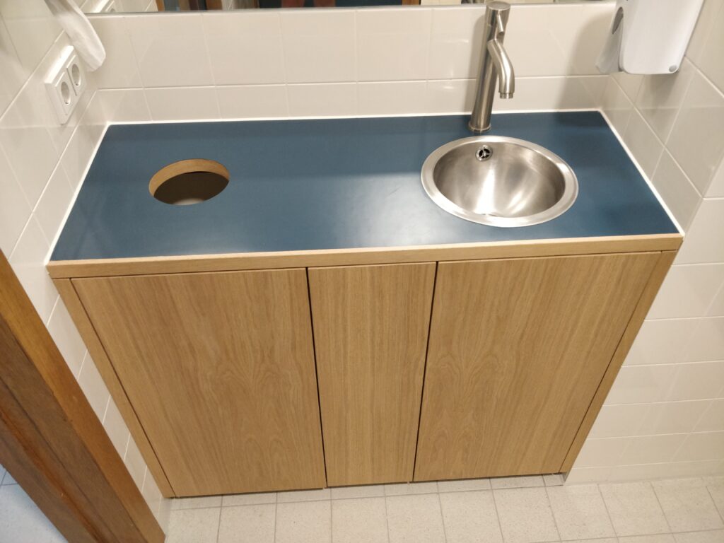 HPL werkblad en eiken herlijst. Opening voor papieren doekjes.