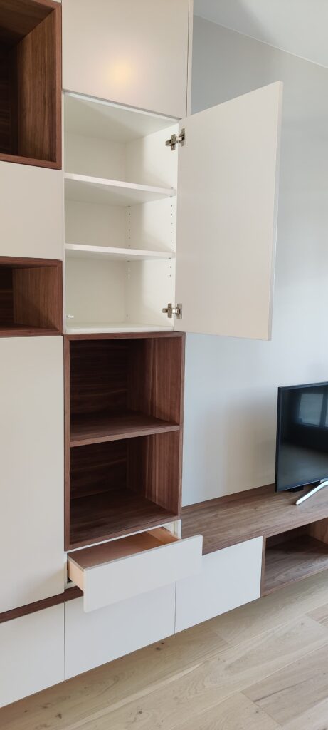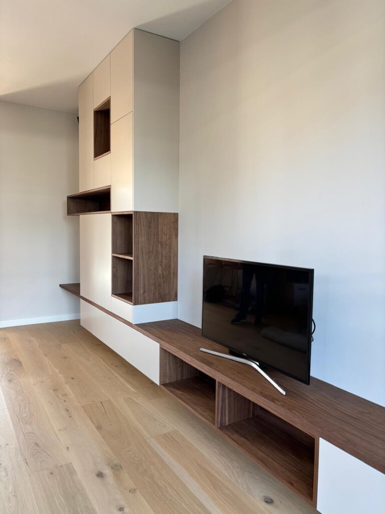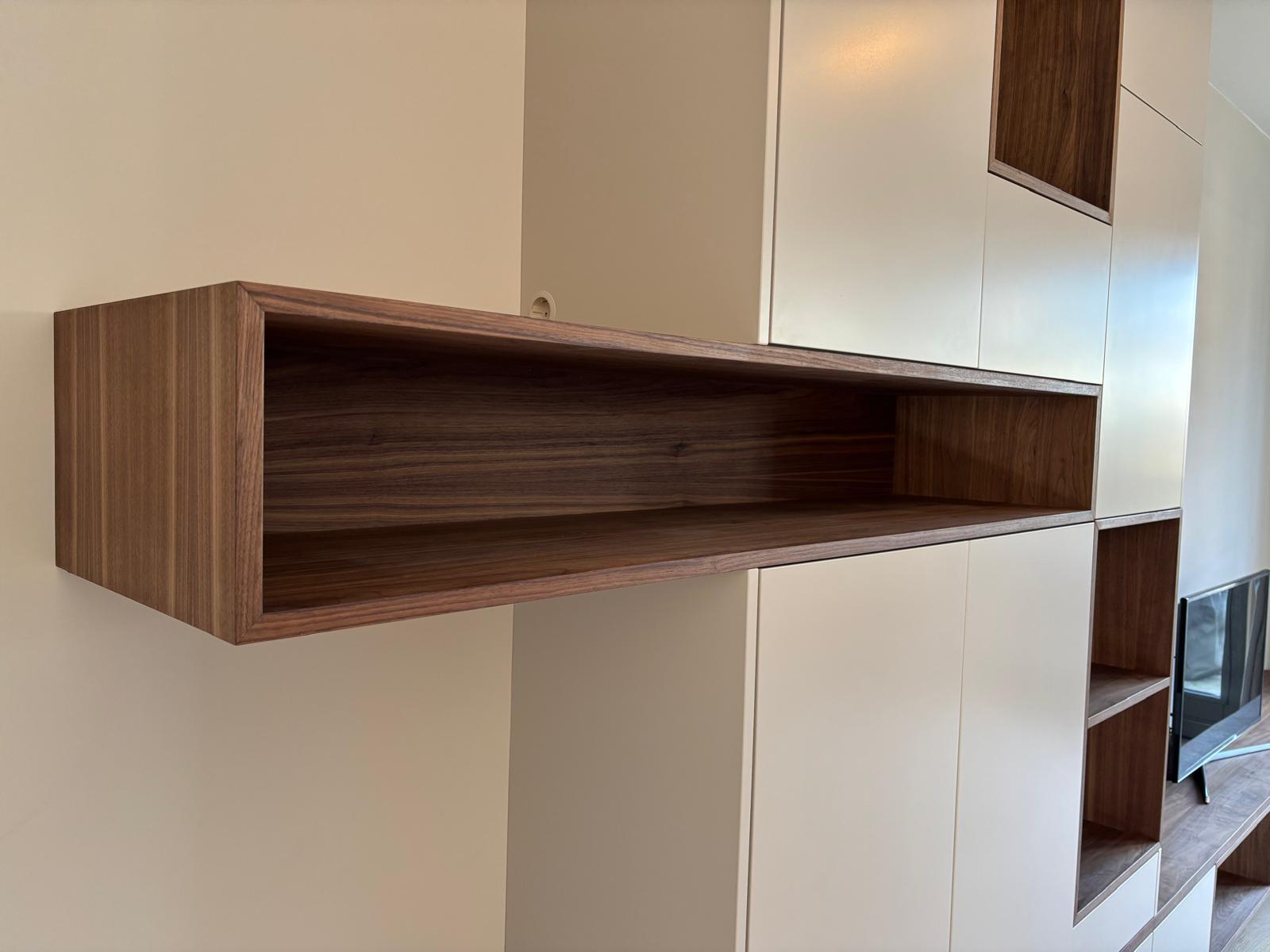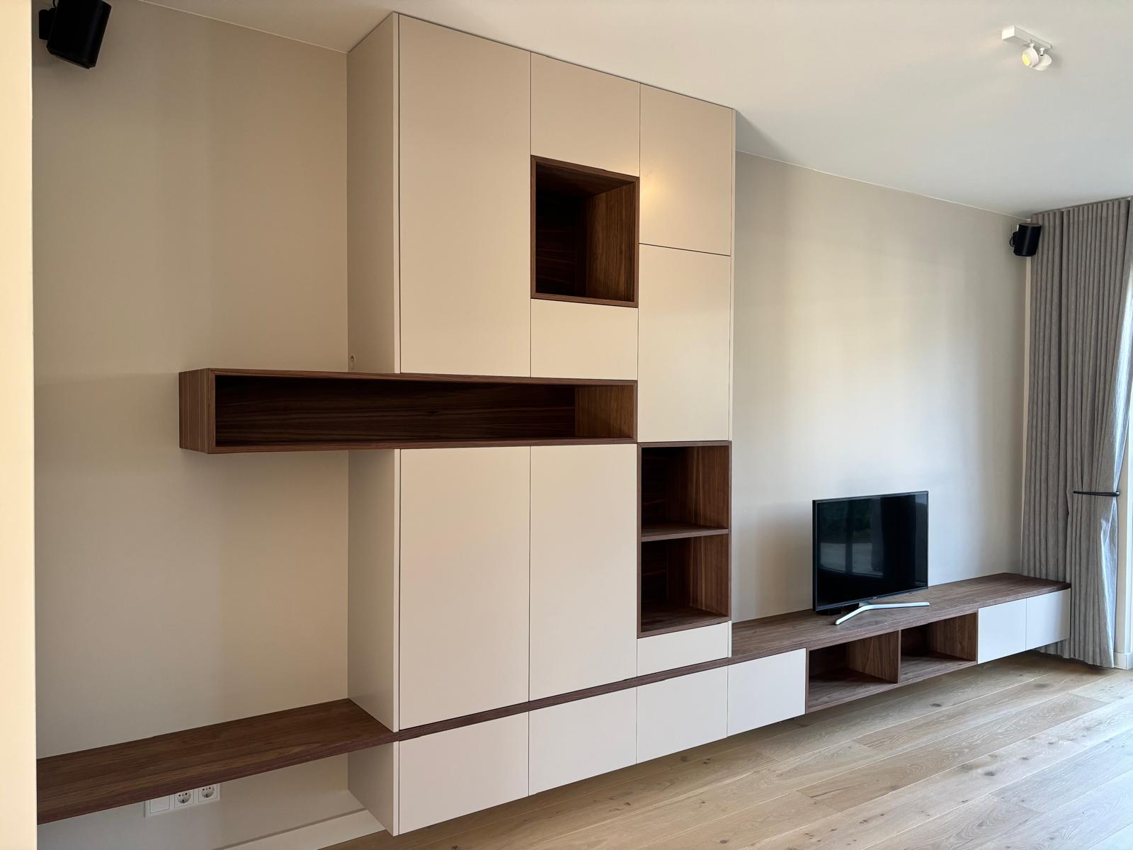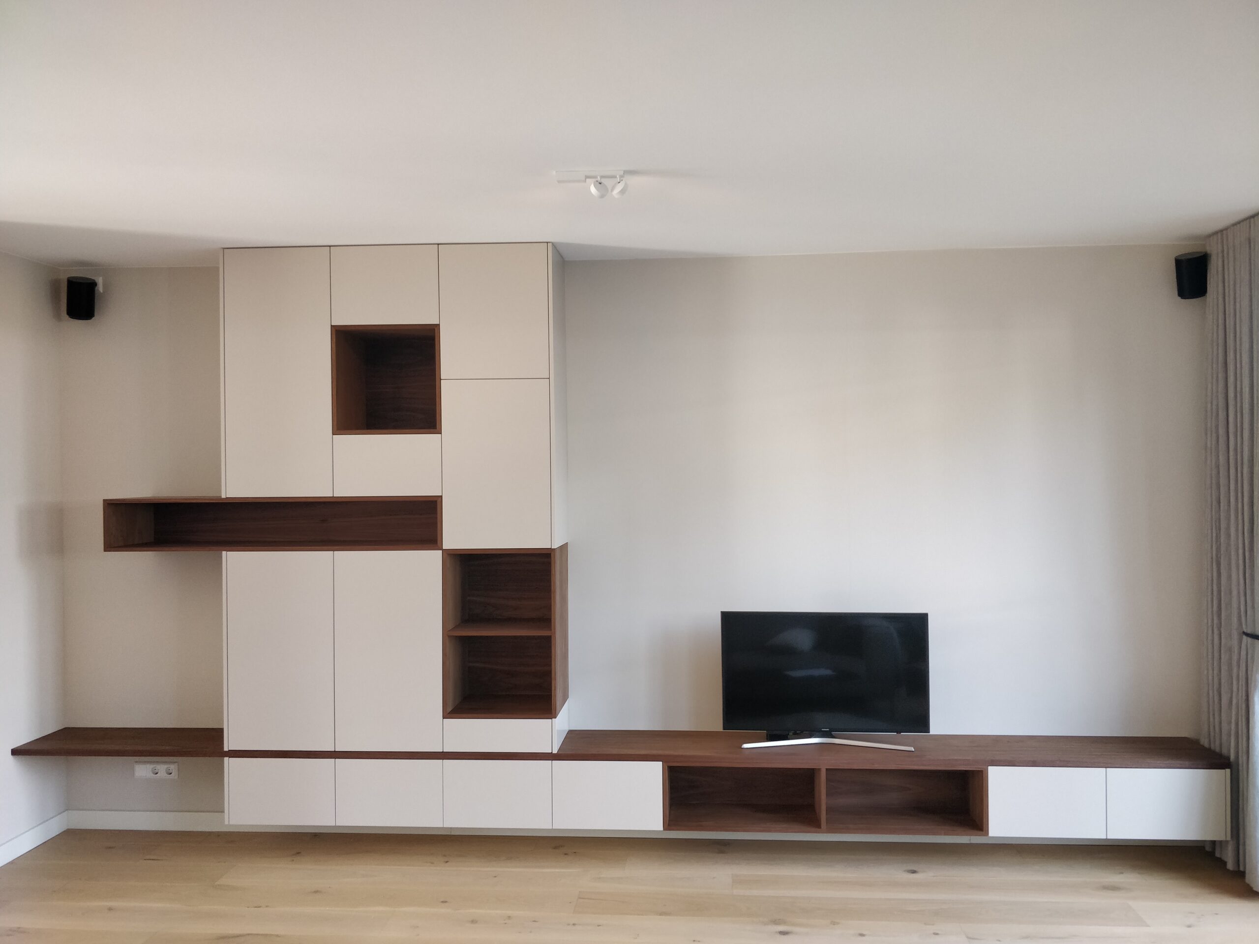 Gespoten Farrow & Ball Elephants Breath 229 met Notenhout. 5.30 meter breed en 2.60 meter hoog.
